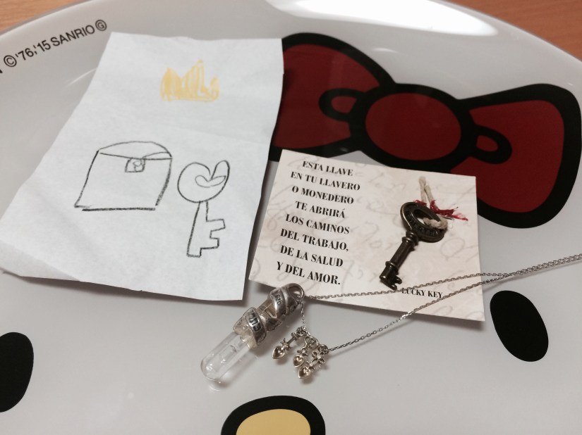 この鍵は、健康や愛をもたらす御守りで、グラナダからマラガに帰る途中で買った。帽子のようなお菓子はポルトガルの田舎の街で路上販売のおばちゃんから購入。皆んなに願いを込めて瞑想してもらうように頼んだ。本当に叶えたいこと、つまり、叶う可能性があること、叶うと信じられるものを選ぶことがポイントね!