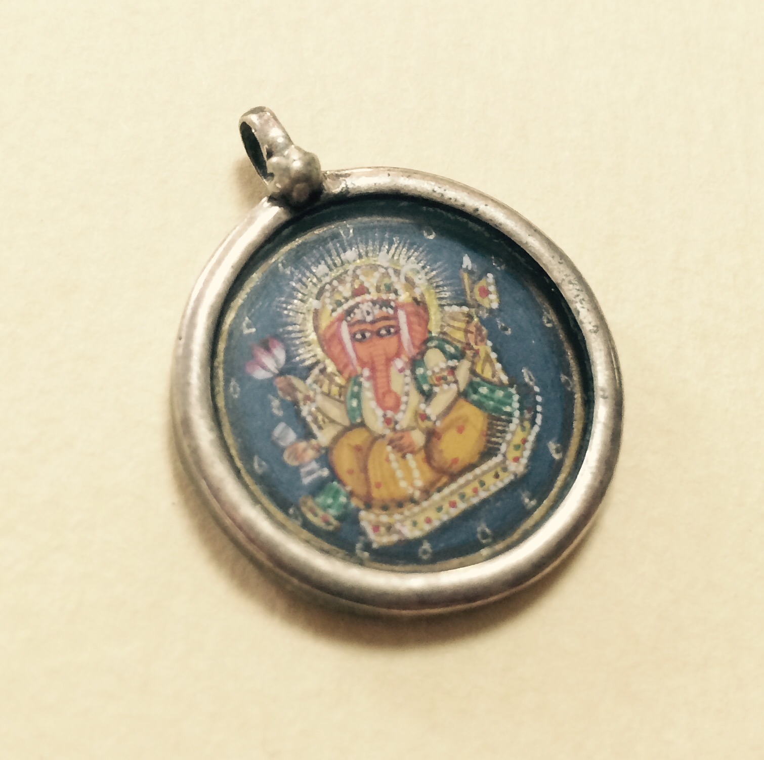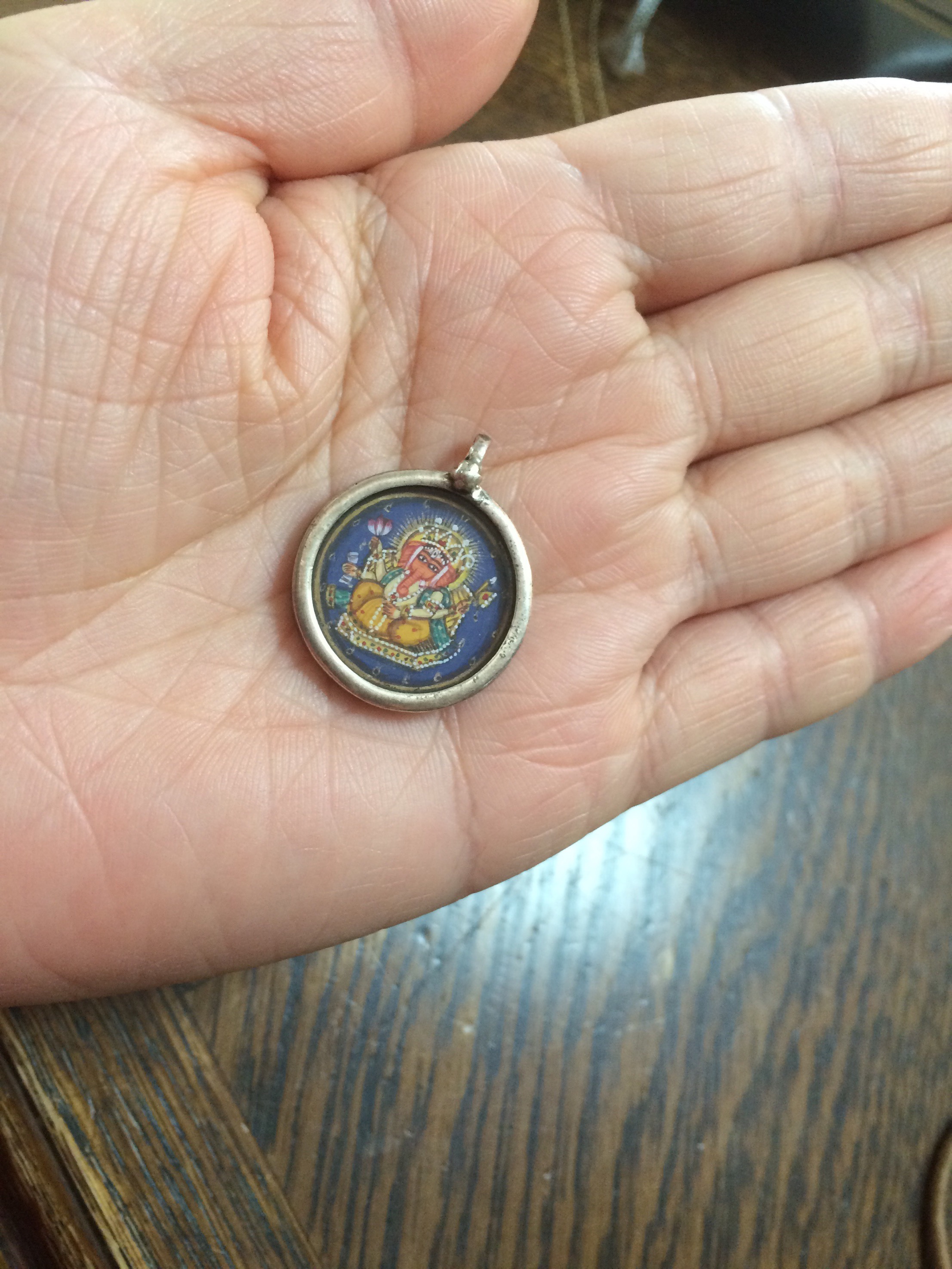 今朝は実家の母のアクセサリーの整理の手伝い。そうしたら出てきた、ガネーシャ。昔、私がムンバイで買ってきたものでした(^ω^)細密画なんですよ。