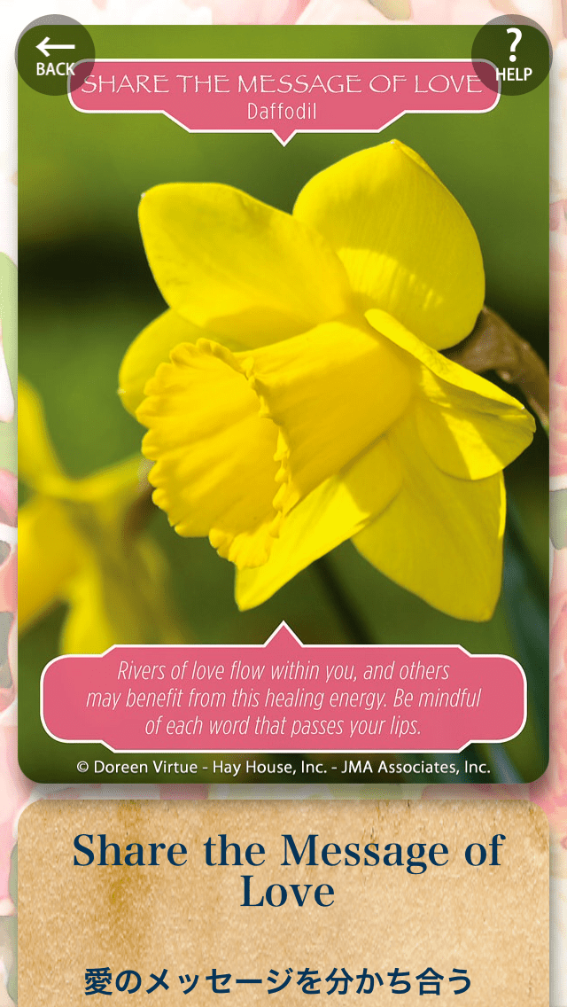さらなるメッセージを携帯のアプリであるカードに聞いたら、ジャンプカードで出てきたのが、スイセンで、「愛を分かち合う」でした。自分と同じような思考、心を持つ人と時間や空間を共有することで、安心して心を開いて、広義の愛をシェアできるということでしょう。彼女も、卒業後にはきっと愛を与えるヒーラーになり、多くの人を励まし、勇気付けていくことと思います。