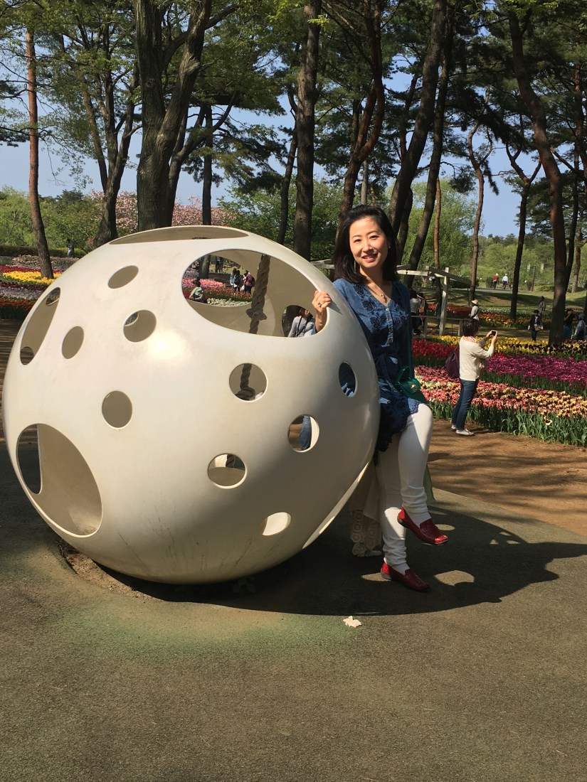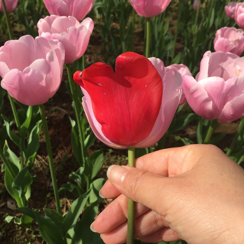 ピンクのチューリップ畑に1つだけ突然変異で赤い花弁のあるものもありました。角度によって♡にみえます(*^◯^*)
