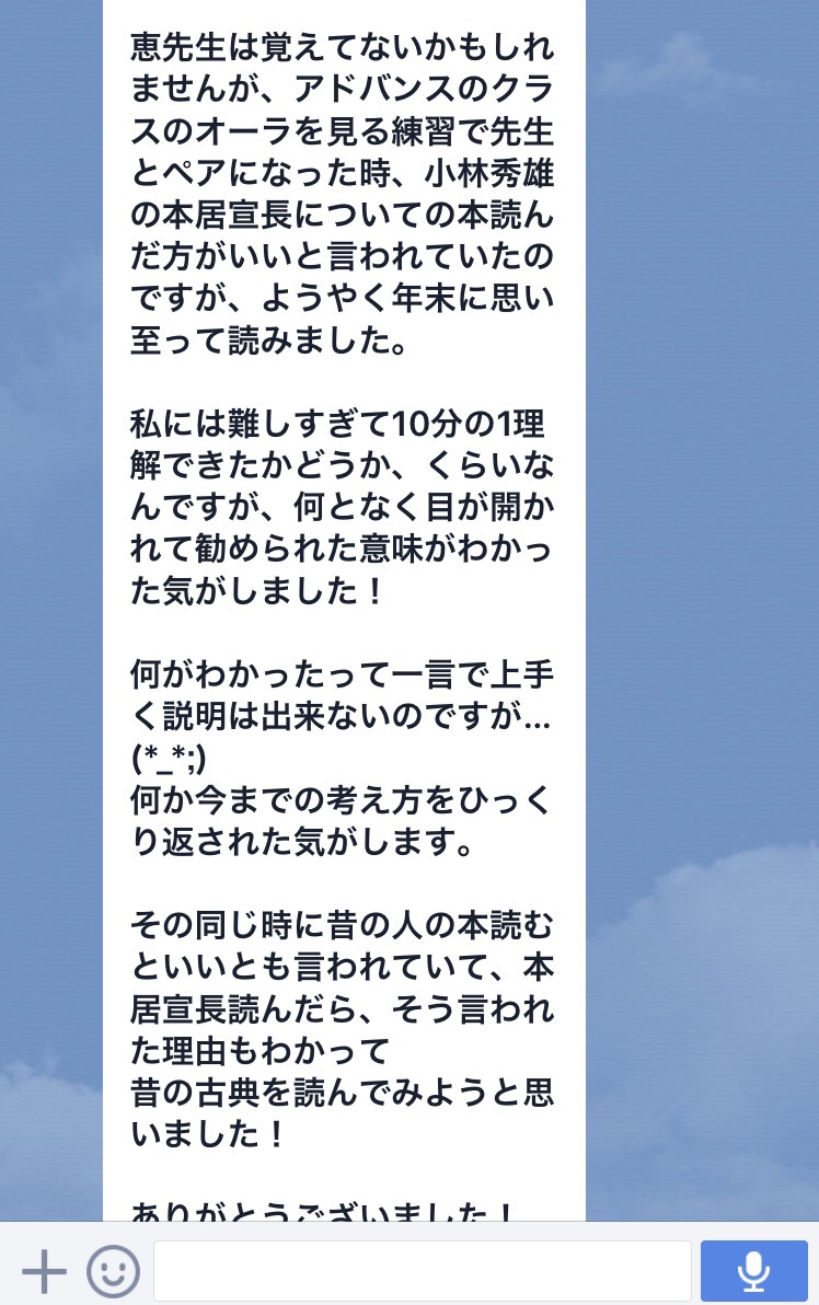 小林秀雄も、本居宣長も、生きること、人間とはなんぞや、自分とはなんぞや、と探求し続けたんですよね。あの小林秀雄のような作家、哲学者でも、宇宙の真理は言葉では表せない。感じて理解するもの、言葉を超えたものだとご本人もよく理解されていた。そこに魅力を感じていたんだと勝手に私は思ってます。