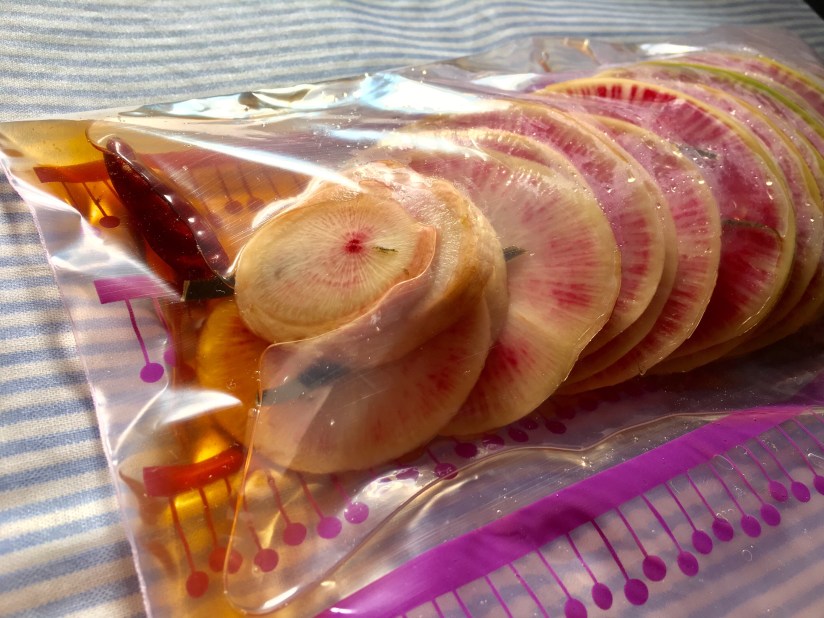 どうも今週は身体のケアが大切な週らしいので、紅芯大根で千枚漬けならぬ百枚漬けを作って見ました〜 ナチュラル ハーモニーさんから宅配されてくる完全無農薬のお野菜セットに入っていたもので。甘辛のお味が大好きです。