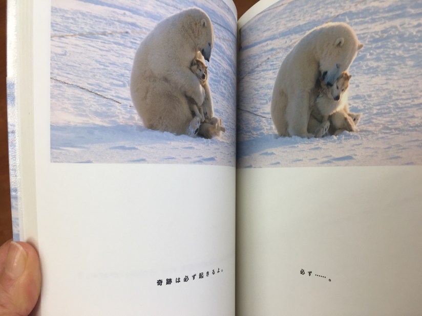とここまでをFBで書いた途端、この本を手渡された。半年間何も食べてない野生のシロクマが、犬を食べずにハグして遊び始めたところをおさめた写真集。奇跡は起きるんです!