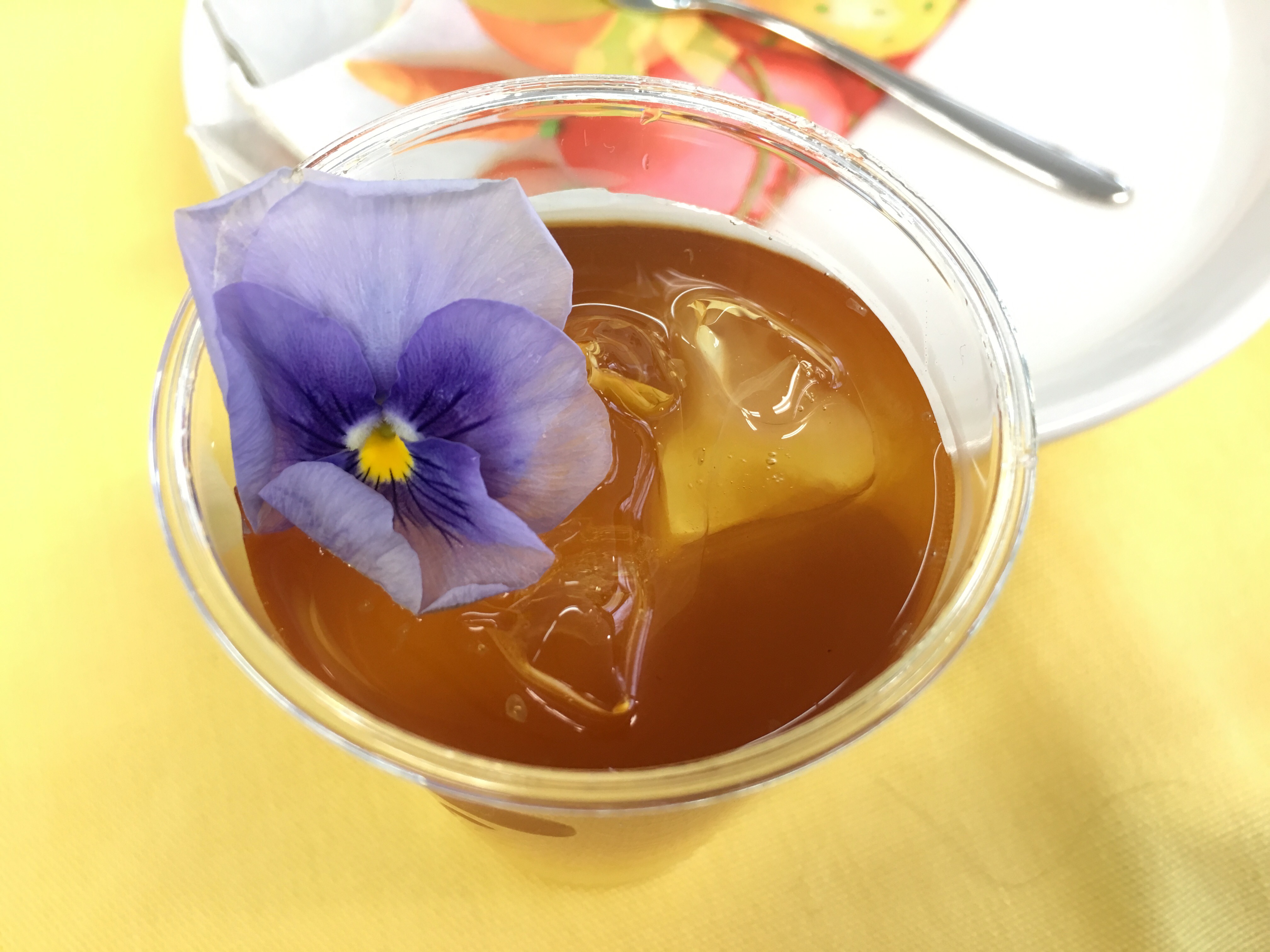 オレンジジュース、シロップを使った紅茶のウェルカムドリンクの作り方を習いました。グラデーション、スミレとのコントラストが美しい。