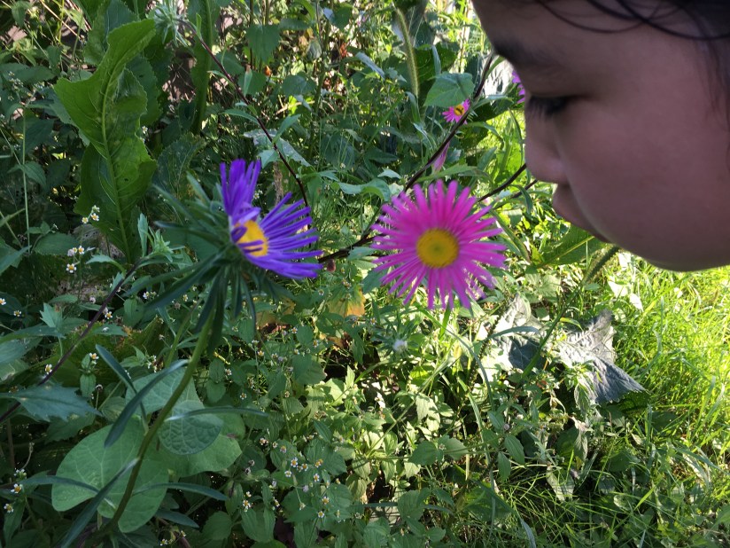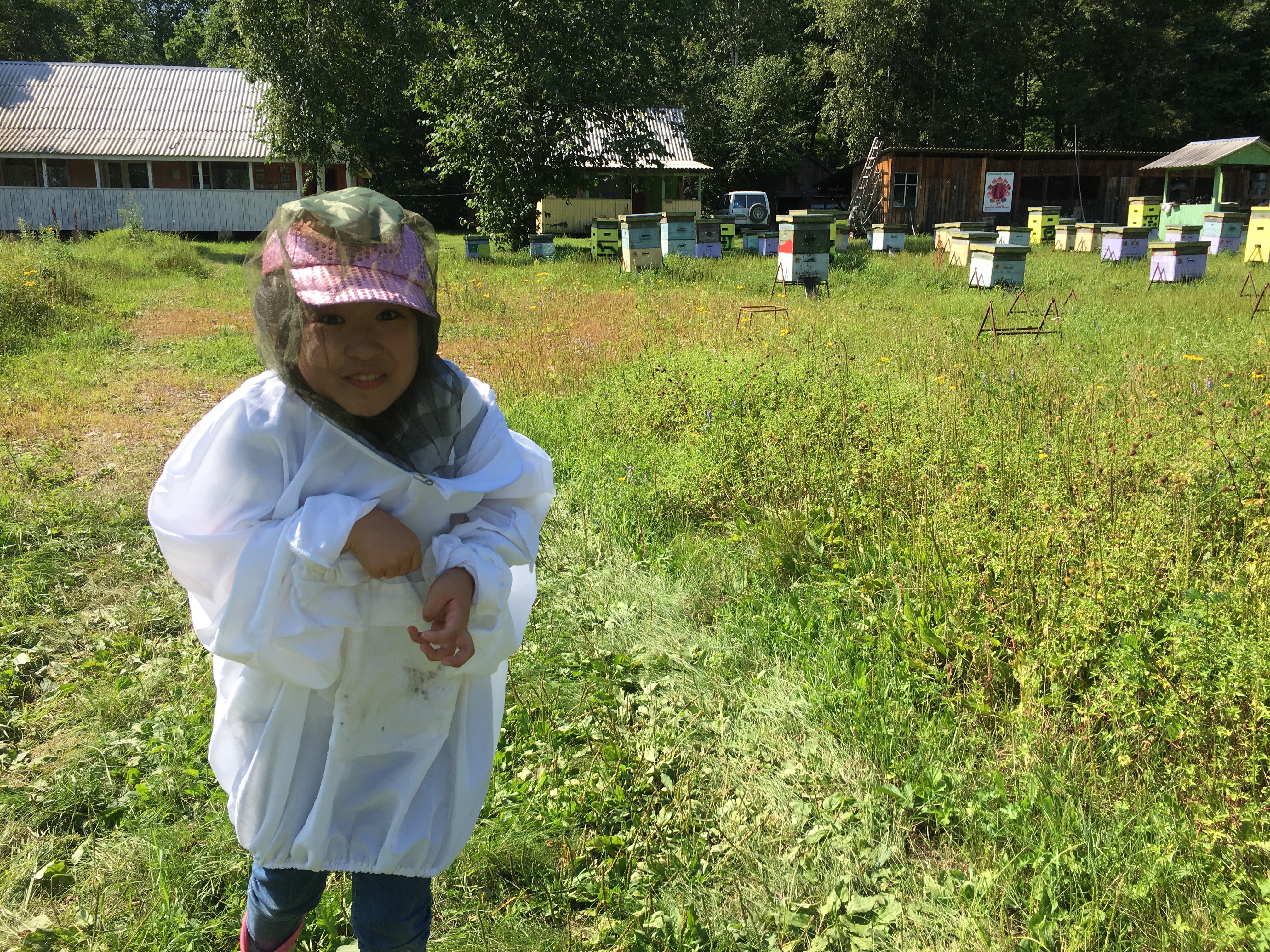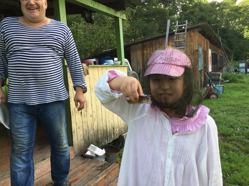 タイガにいる数日で、みるみると娘がたくましくなるのをみました。蜂を育てている場所なので、蜂がブンブン。虫も沢山。蛇もいます。全てが怖くて、はじめは家から出たくない!と。それでもセルゲイおじさんが面白いことをしてるから、それにつられて、顔のネットと、蜂蜜を採るときの制服を貸してもらって外に出る。