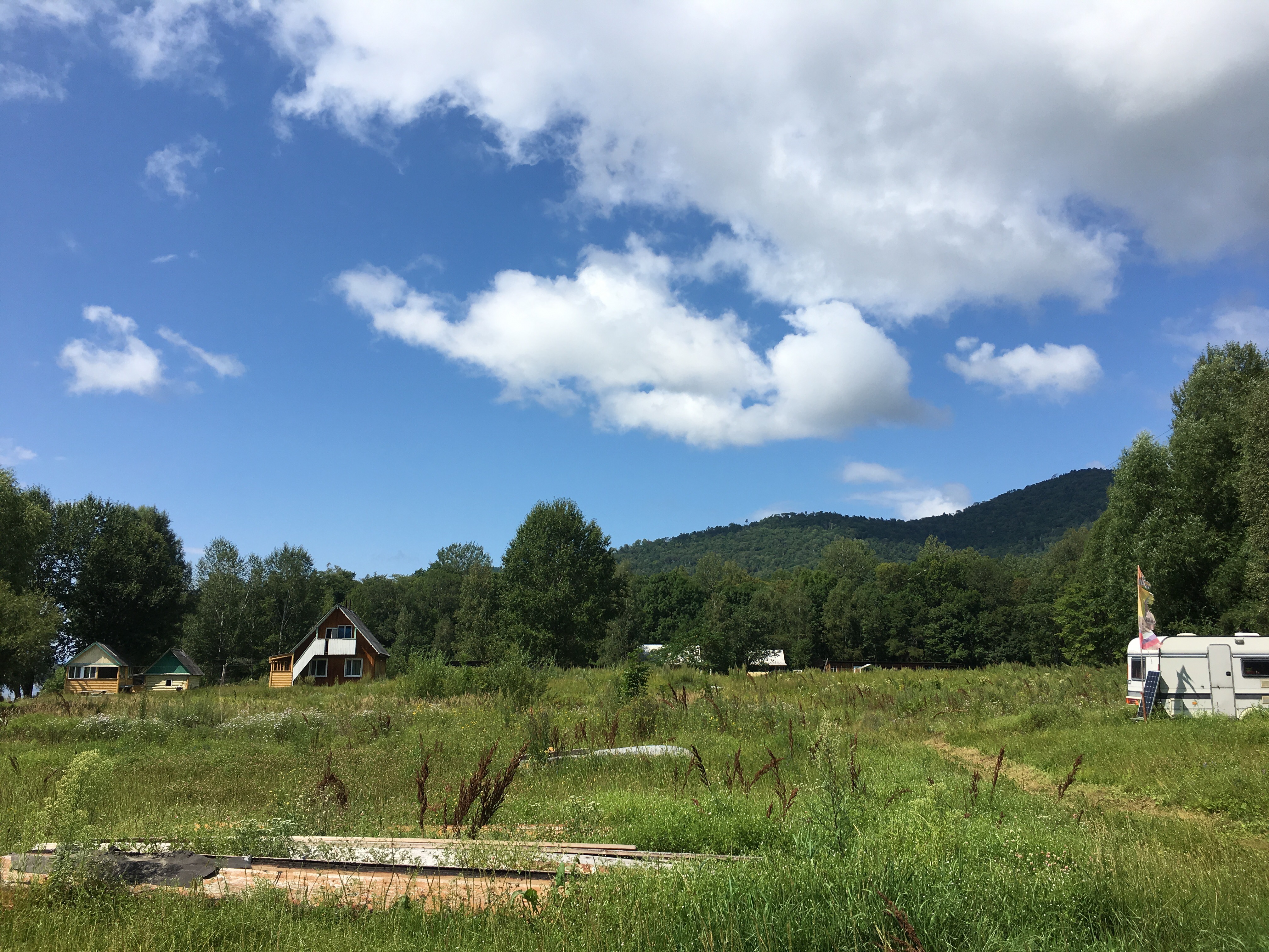 まだハバロフスクは排気ガスが酷いですが、1時間くらいすると殆ど対向車は来ません。周りはのどかな田園風景というか、トウモロコシ畑と草原と、昔ながらの木でできた家などが並びます。20年前にハバロフスクに来た時には、こんな田舎までは来れませんでした。でも、今回はタイガへ行くことが目的だったし、20年も経てば自由も度胸も増すわけで^ – ^