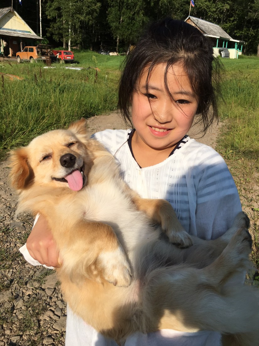 セルゲイさんは、タイガの男。熊や猪も撃ちます。子供が何に興味を持つかよく知ってる。ロシアでは、夏はこのようにダーチャ(菜園付きの別荘)で何週間も過ごして、自然と遊ぶのが普通なんです。言葉は通じなくとも、鼻歌とか動作で娘を誘う。まあ、その上手いこと、上手いこと。サッサと後ろについていく娘。「おい!魚釣りに行くぞ!」と首に魚の籠をかけられる。