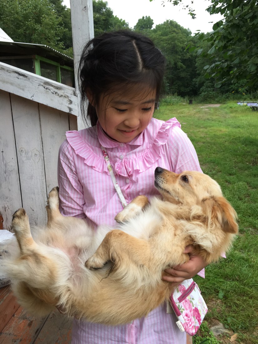 ここで、ママも1つ機転を利かしまして。。。可愛い犬がいるんですけど、娘は犬が苦手。でも、タイガのエネルギーなのか、相性なのか、この犬のことは気に入って。何とか自分の後を追っかけて欲しくて仕方のない娘。「この子は英語で話すと仲良くなれるよ」と言ったら、本気にしたらしく、私がいないところでは「My name is Haruka」とかcome! とか英語で話してました。