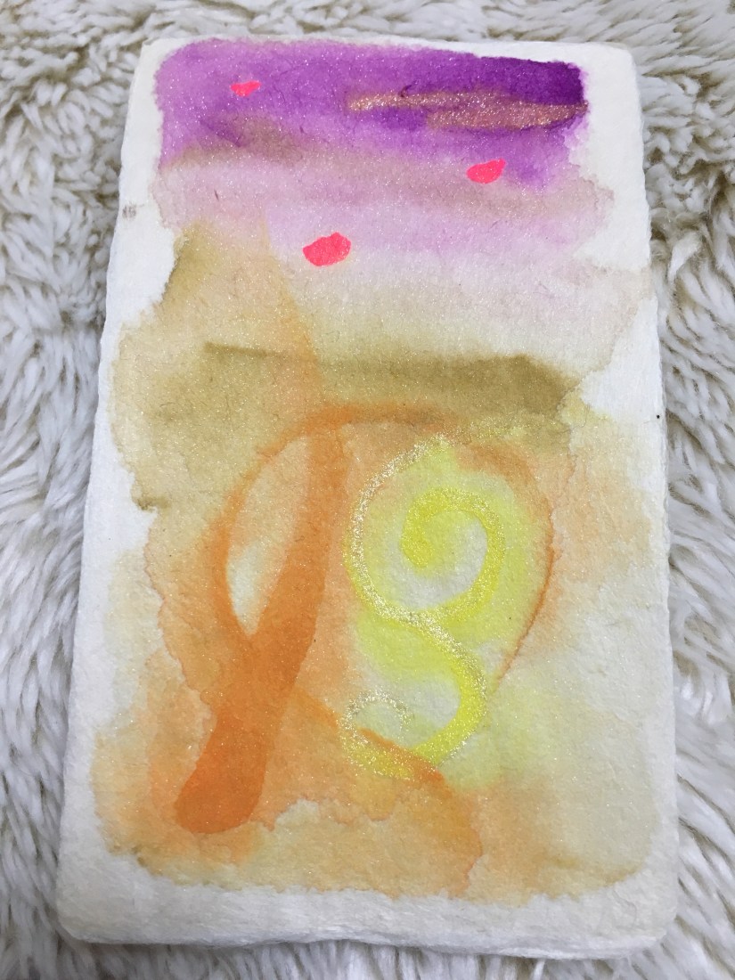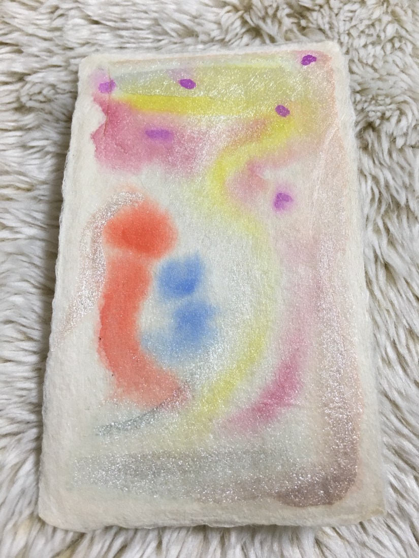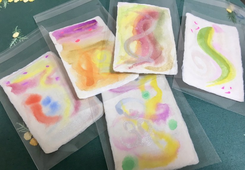 今回お配りしたカードの中で、これが1番初めに描いたものです。お母さんになることを諦めかけている人にあげるように、というメッセージがきたので描きました。お母さんと子供がいるんですよ、絵の中に。本日1番にブースに座ってくれた方にピッタリでしたので、差し上げました。