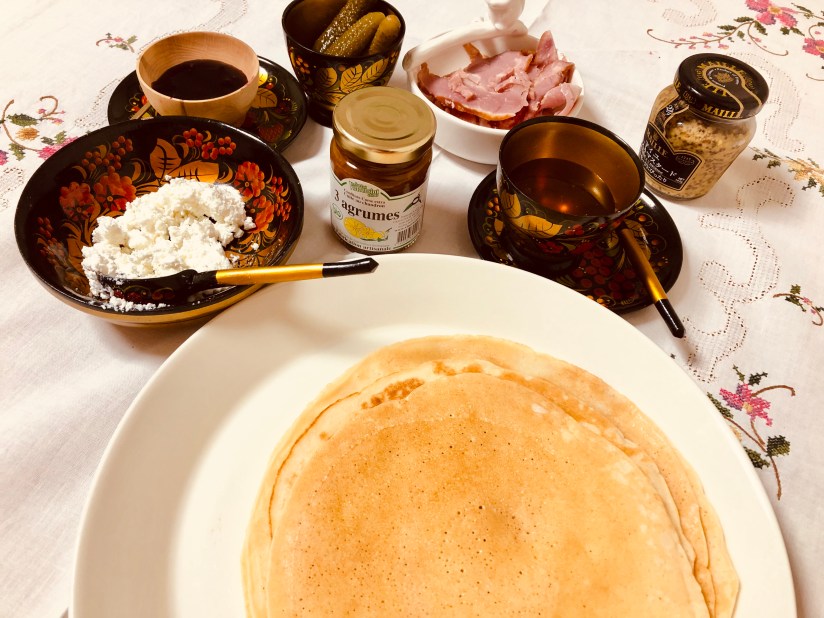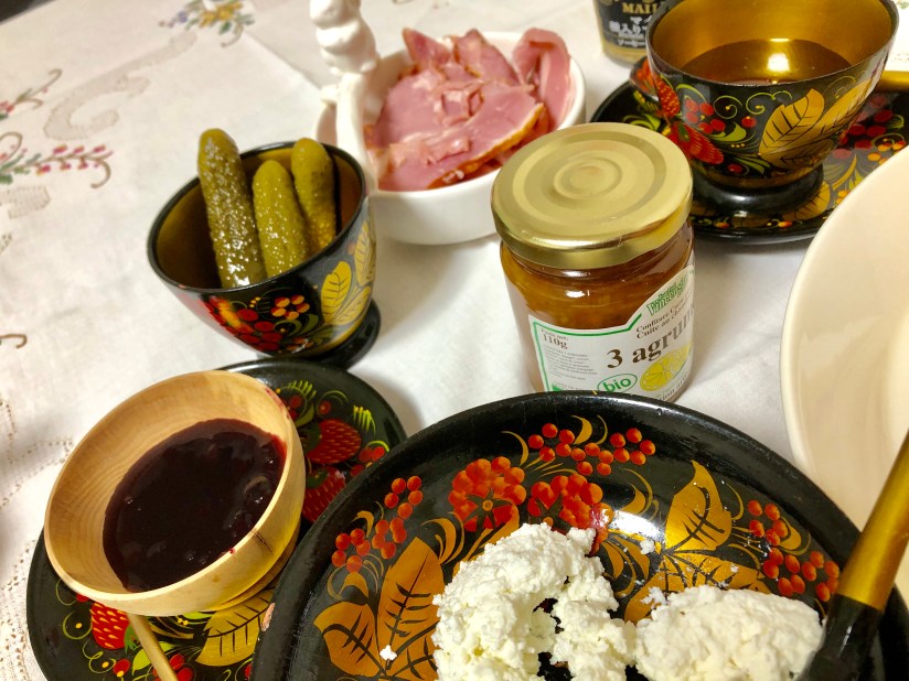 大切にとっておいたコルシカ産のオーガニックの柑橘系ジャムを開け、ブルーベリーのジャムというよりはソースに近いもの(これもロシアで手作りのをよく食べさせてもらいました。ブルーベリーではなくて他のベリーでした)、カッテージチーズ、蜂蜜、ハム、ピクルスなどと食べました。食器はホホロマと呼ばれるロシアの伝統工芸品です。もう15年近く使っているものもあります。