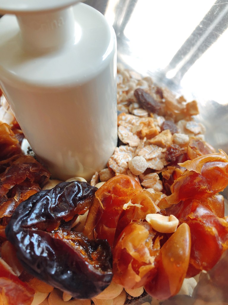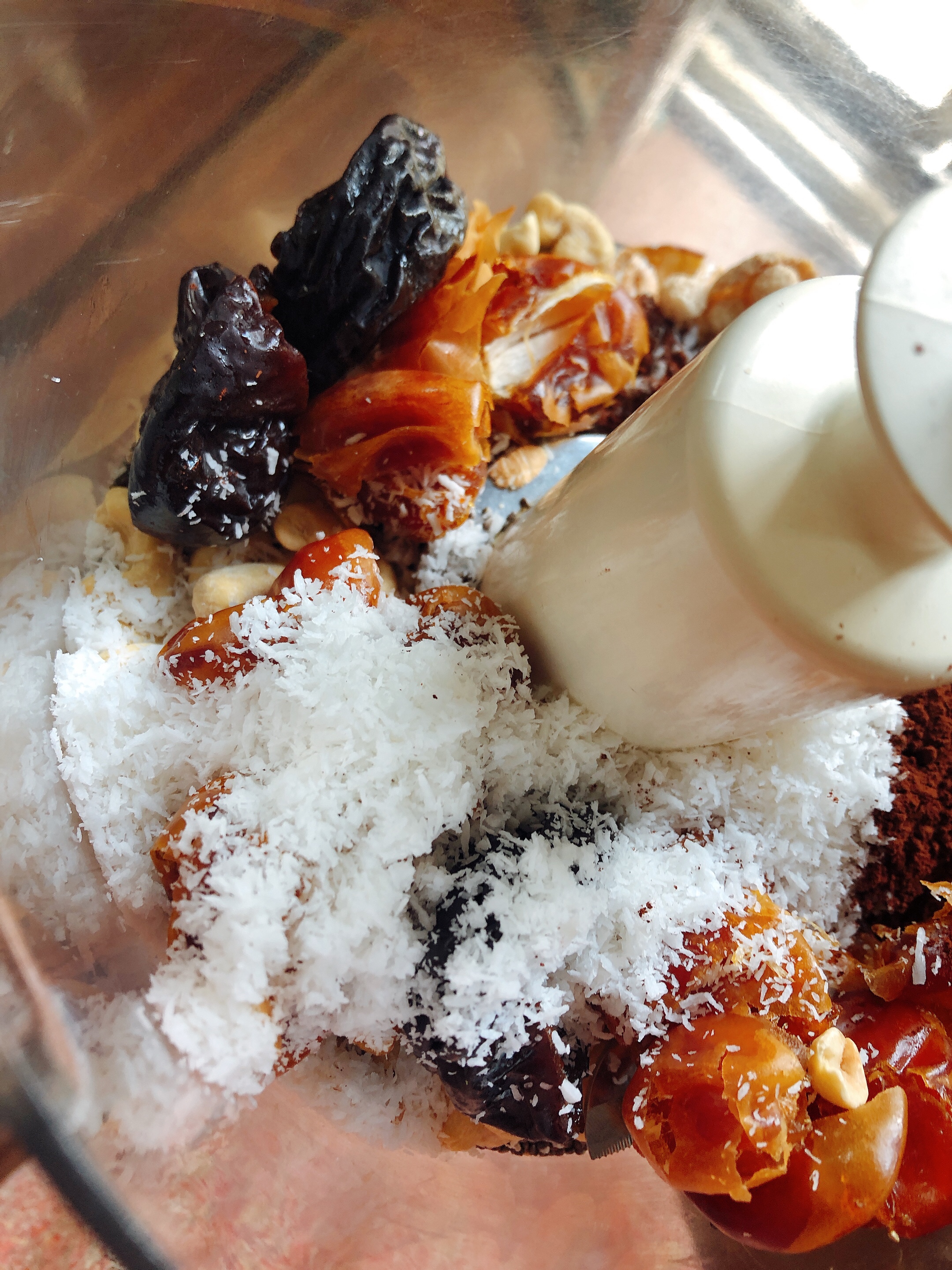 デーツ、プルーン、カシューナッツ、ピーナッツ、カボチャの種、オーツ、ココナッツ、ココアパウダー、レーズン、ココナッツオイルをミキサーでガーッ