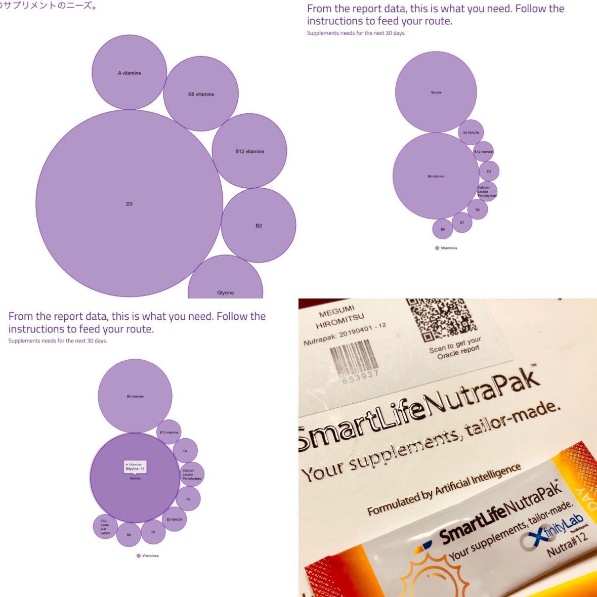 私のDNAという基本データに、ウェアラブルが1日中測る私の血圧、心拍数、血中酸素濃度、などなどを、「オラクル」という名前のAIが24時間解析し、先月の私の身体と行動パターンを分析し、今月の過ごし方を教えてくれる。世界にひとつ、私だけのサプリが出来てくる。