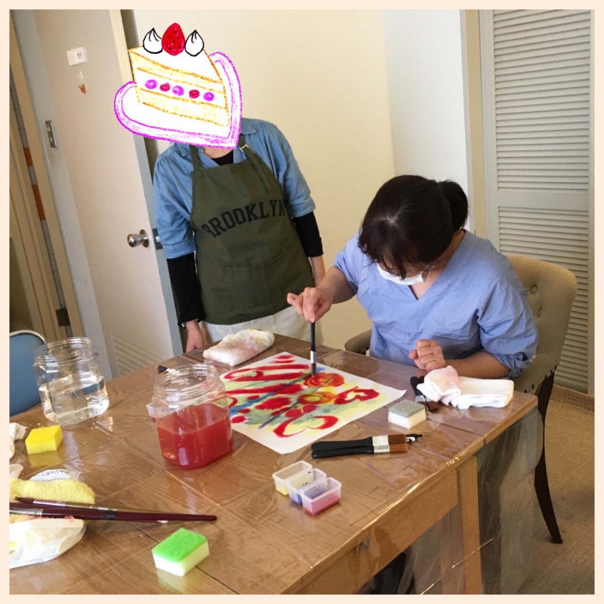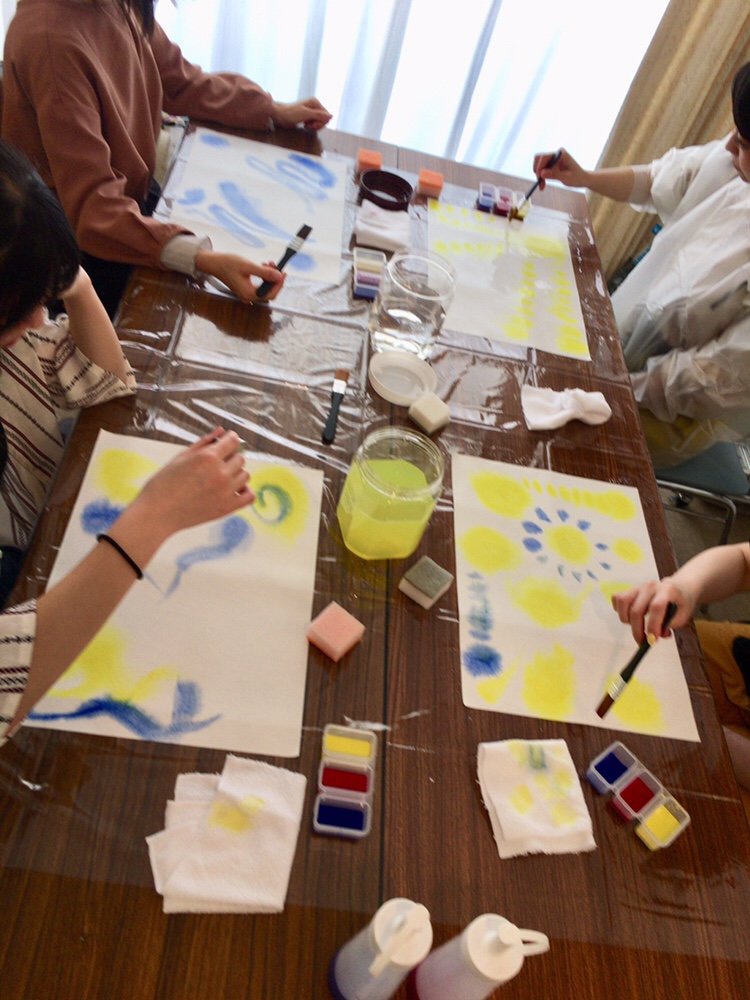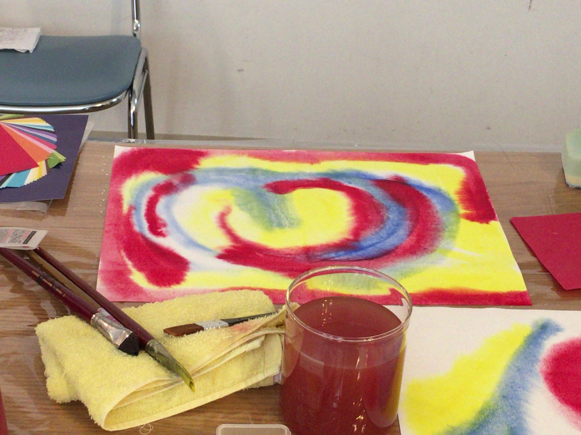 栗原さんとのワークショップ。「灯(ともしび)の狭間から 〜水彩画でハートを癒す〜」。自分と繋がる、解放する、自分や他者を信頼する、ということをシュタイナー教育で実践されている滲み絵や、遊びや、スーフィーの詩人ルーミーの詩やインド舞踊を混ぜて私たちなりにアレンジして提供しました。