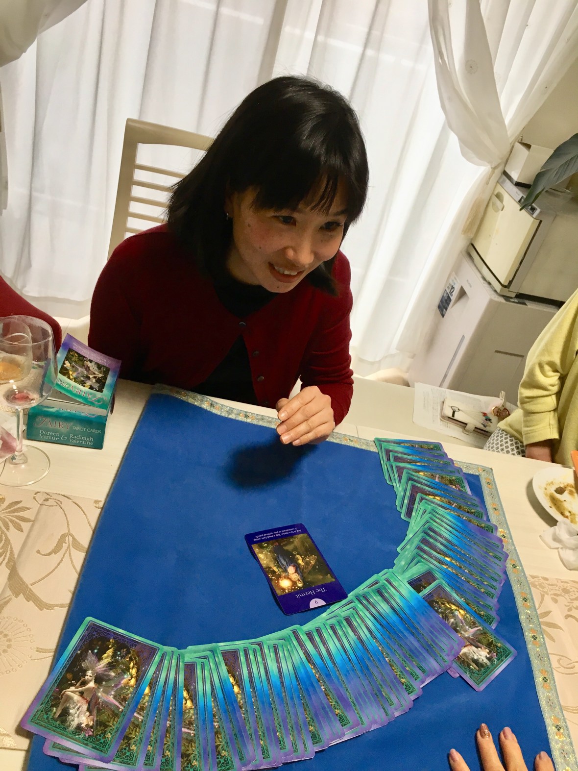 写真は、マッサージ、オラクルカード、タロットカードの練習をしにきた卒業生。透視リーディングやヒーリングはいろんなスキルと組み合わせてできます。一生できる仕事です。人を、そして自分を幸せに豊かにできるんです。