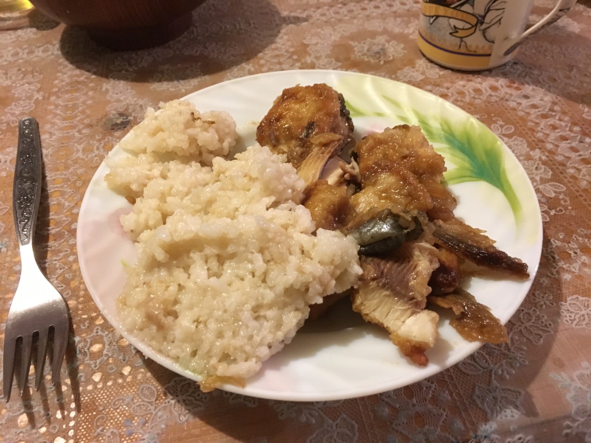 あとは、川で魚を釣って、フライにしました。玉ねぎ入れて、醤油、蜂蜜を入れて甘辛に。極東ロシアは文化的にはアジアなので、お醤油も普通に使いますよ。