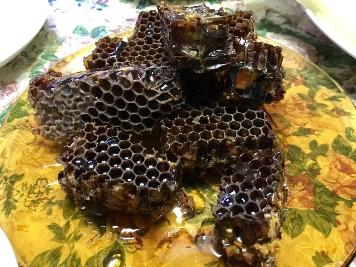 蜂の巣は他の国で食べたことあるけど、それはもっと白かった。セルゲイさんがいうには、数週間しか経ってないからだそうです。写真にある黒っぽいのがお土産にもらったもので、だいたい1年半経った巣だそうです。見た目はアレですけど、ワイルドにいける人、栄養に興味のある方、ベジタリアンには超オススメかも!美味しいですよ。ロシアは沢山の花があるから、香りが複雑で深いんです。