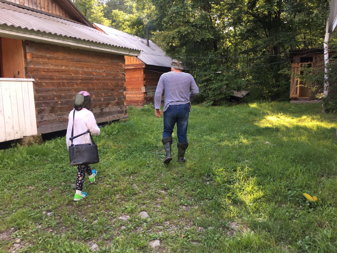 タイガにいる数日で、みるみると娘がたくましくなるのをみました。蜂を育てている場所なので、蜂がブンブン。虫も沢山。蛇もいます。全てが怖くて、はじめは家から出たくない!と。それでもセルゲイおじさんが面白いことをしてるから、それにつられて、顔のネットと、蜂蜜を採るときの制服を貸してもらって外に出る。
