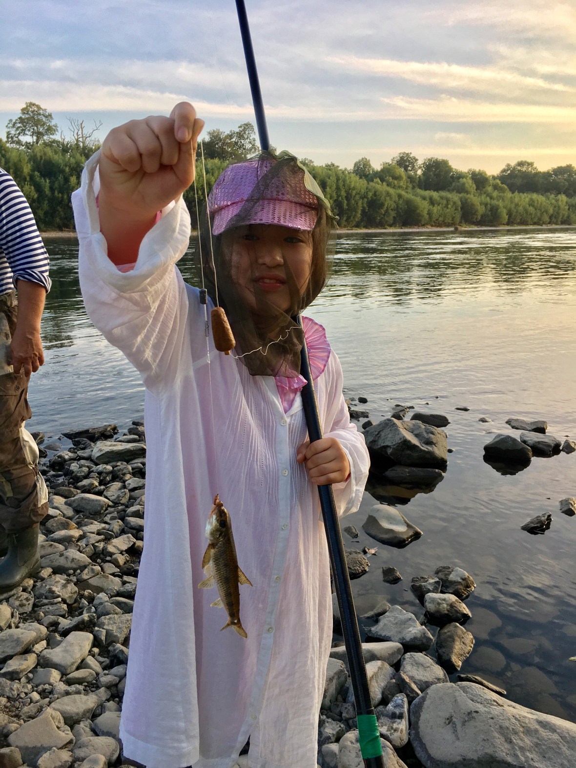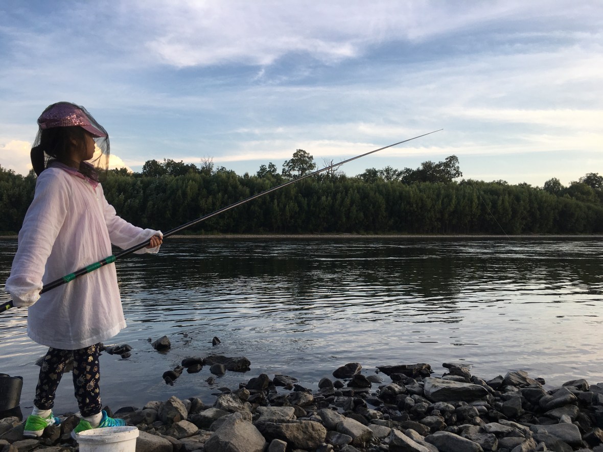 タイガの男2人からホル川で魚釣りを習う。魚が面白いように釣れます。それらはその場でさばいて焼く。これが、もう、本当に美味しいんです!魚は苦手な娘も、自分で採ったものだから、少し食べる。